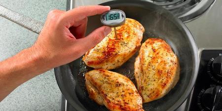 可能很多人说,那么什么叫内部温度?怎么测量呢?内部温度其实是指食物加热的时候食物中心的温度。因为烹调加热的时候必须保证内部温度达到才能有效的避免可能的风险。如果只是外表热了,内部没热,如果存在寄生虫、致病菌的话,就根本无法杀灭。所以,一定要保证内部温度。其实就是我们常说的加热熟透。那么,这个内部温度怎么测量呢?这个其实有专门的温度计。如这张图片。这种温度计它有一个很长的探针,探针的头部就有一个温度感应装置。测量的时候,将探针插入食物内部 ,就能感应到内部的温度。建议大家可以买一个。