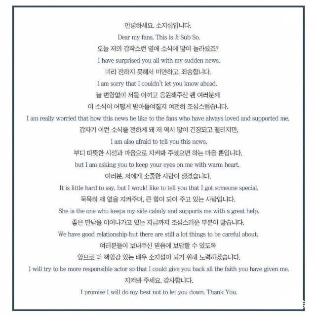 苏志燮也通过经纪公司账号承认了恋情,他说赵恩静一直默默地首付在他的身边,给了他很大的鼓励和力量,对他来说非常珍贵,希望粉丝可以接受她,也就隐瞒恋情对粉丝表达了歉意。