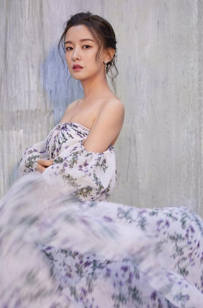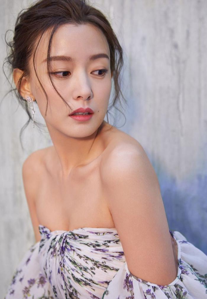 周奇奇早期写真,身穿一件碎花抹胸连衣裙,裙子上面是紫色的花纹图案,看起来就很清新的样子,而且周奇奇穿碎花裙仙气飘飘,气质简直好得没话说