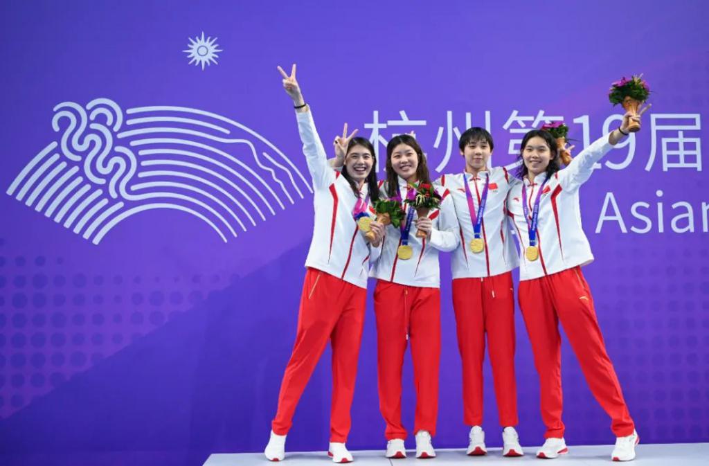 9 月 24 日,中国队选手张雨霏、吴卿风、程玉洁、杨浚瑄(从左至右)在颁奖仪式上。新华社记者 黄宗治 摄