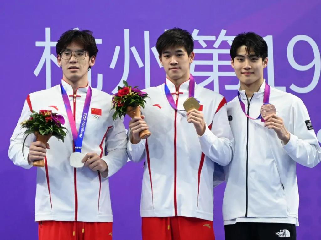 9 月 24 日,冠军中国选手潘展乐(中)、亚军中国选手王浩宇(左)和季军韩国选手黄宣优在颁奖仪式上。当日,杭州亚运会游泳项目男子 100 米自由泳决赛在杭州奥体中心游泳馆举行。新华社记者 黄宗治 摄