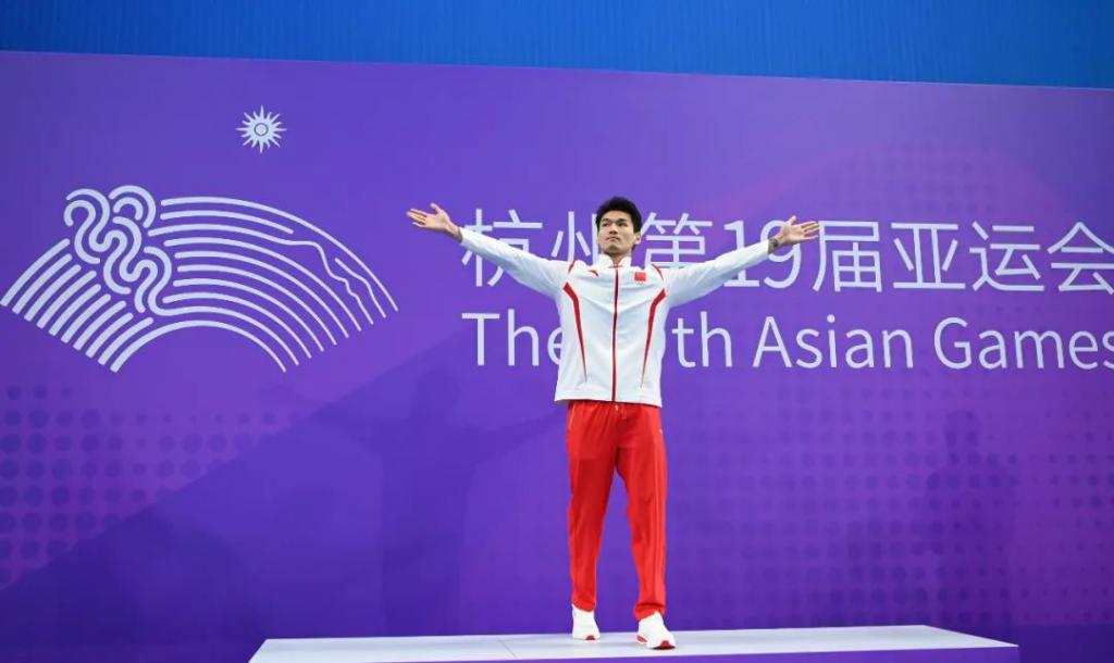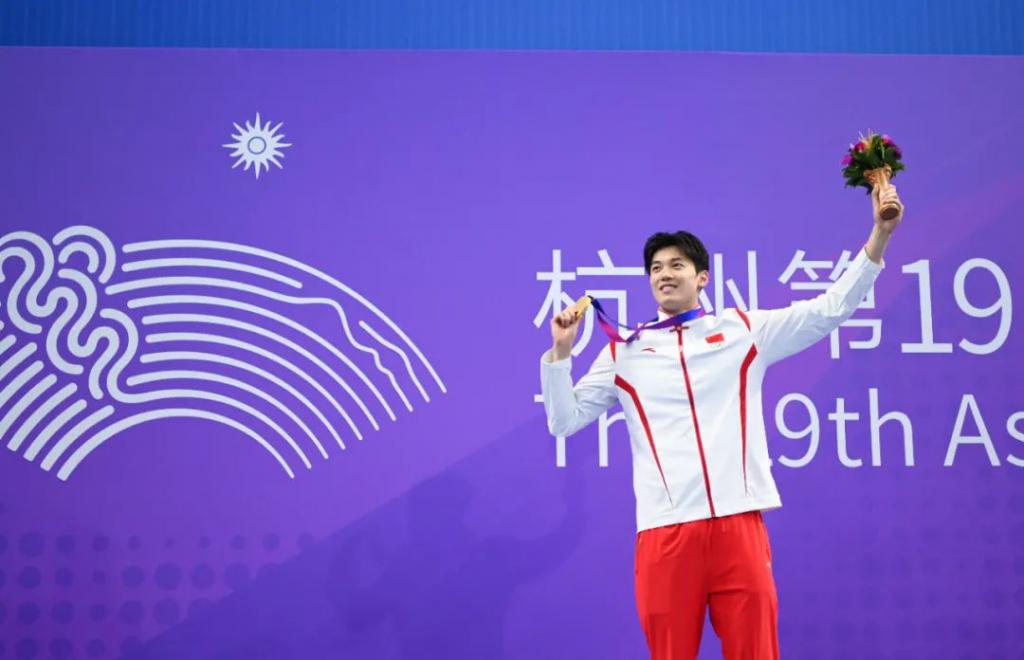 9 月 24 日,中国选手汪顺在颁奖仪式上。当日,在浙江杭州奥体中心游泳馆进行的杭州亚运会游泳比赛男子 200 米个人混合泳决赛中,中国选手汪顺以 1 分 54 秒 62 的成绩获得冠军。新华社记者 黄宗治 摄