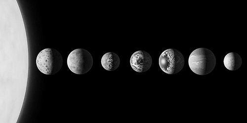 TRAPPIST-1系统中7颗行星示意图,TRAPPIST-1b(最左侧)离恒星最近。图片来源:NASA/JPL-Caltech