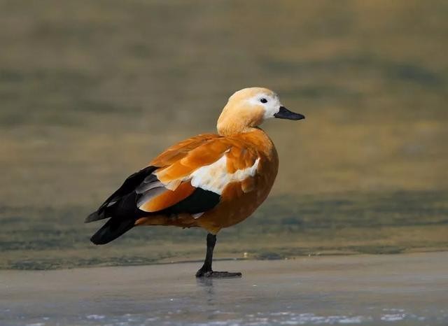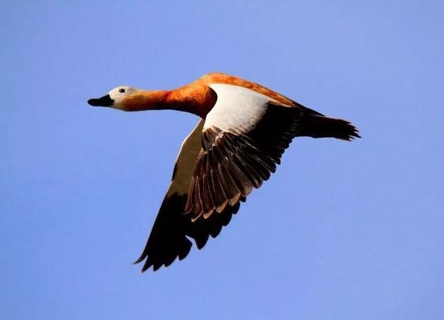 赤麻鸭(学名Tadorna ferruginea)体长51-68厘米,体重约1.5千克,比家鸭稍大。全身赤黄褐色,翅上有明显的白色翅斑和铜绿色翼镜;嘴、脚、尾黑色;雄鸟有一黑色颈环。飞翔时黑色的飞羽、黄褐色的体羽和白色的翼上和翼下覆羽形成鲜明的对照。栖息于开阔草原、湖泊、农田等环境中,以各种谷物、昆虫、甲壳动物、水生植物为食。广泛分布于欧亚及北美洲大陆,在辽阳地区为冬候鸟或旅鸟,常见于城区周边湿地,属国家“三有”保护野生动物。