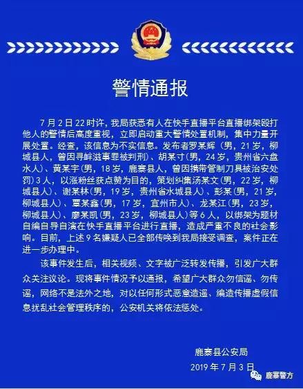 据广西柳州鹿寨县公安局通报,7月2日22时许,我局获悉有人在快手直播平台直播绑架殴打他人的警情后高度重视,立即启动重大警情处置机制,集中力量开展处置。经查,该信息为不实消息。发布者罗某辉(男,21岁,柳城县人,曾因寻衅滋事罪被判刑)等人以涨粉丝获点赞为目的,以绑架为题材自编自导自演在快手直播平台进行直播,造成严重不良的社会影响。目前,9名嫌疑人已全部被传唤接受调查,案件正在进一步办理中。