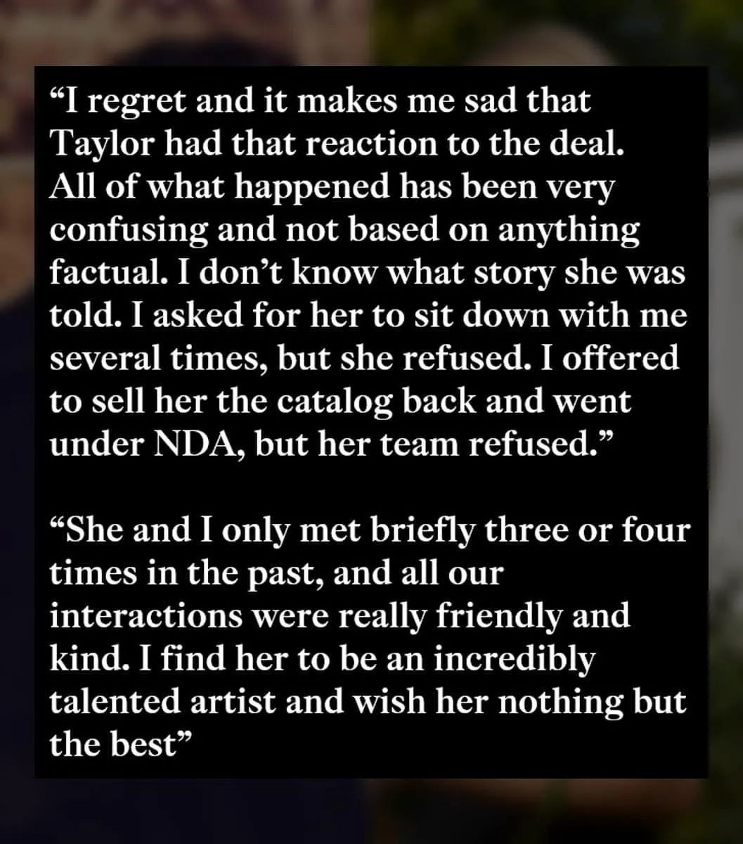 此前斯库特·布劳恩花费三亿美元收购了霉霉前五张专辑的版权,并在网络上和霉霉开启了战争,结果双方两败俱伤,都没有得到理想的结果,而霉霉也决定重录自己的专辑,重新发行。