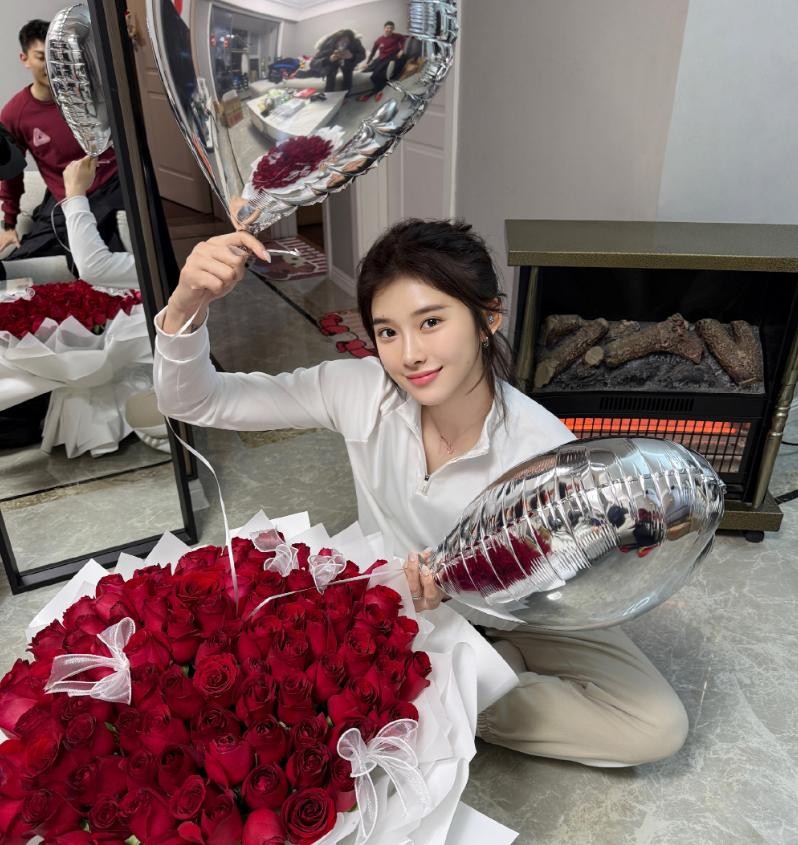 有网友在吴艳妮发出的相片里,看到气球反光里的她的爸爸妈妈。但可以肯定是,礼物和玫瑰应该是一位穿运动服的帅哥送的,这位帅哥也出现在气球的反光里。