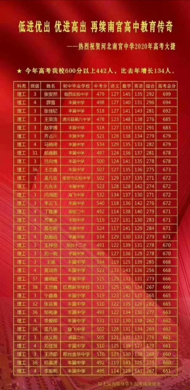记者了解河北南宫中学2020高考600分以上442人,比去年增长134人