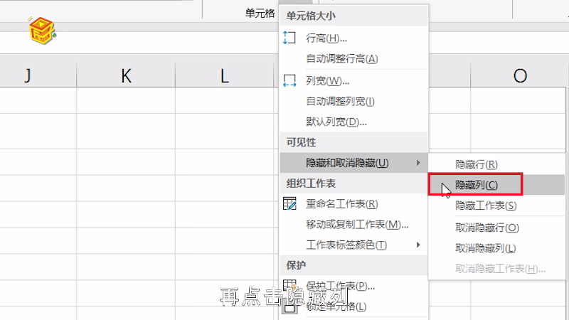 2.在弹出的下拉框中,选择隐藏和取消隐藏,再点击隐藏列,就隐藏好了。