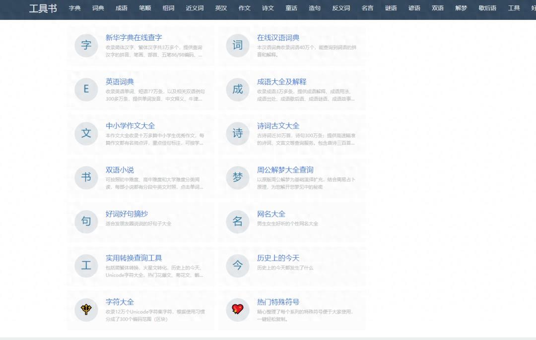 这是一个工具类的网站,主要是提供各种各样的在线词典,比如字典、词组、作文、童话、造句、名言、谜语、谚语、歇后语等工具,非常适合写作使用。
