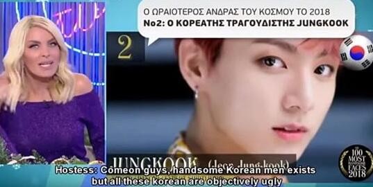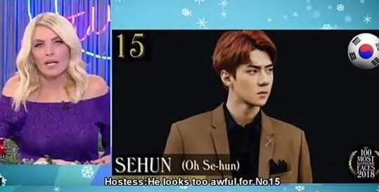 综合韩国《亚洲经济》、《国民日报》1月8日报道,5日播出的一档名为“Eutixeite”的节目中,介绍了由美国“TC Chandler”网站选定的“全球最帅100张面孔”,韩国防弹少年团成员田柾国、金泰亨,Wanna One成员姜丹尼尔和EXO成员吴世勋入选。主播凯特丽娜(Katerina)在节目中评价吴世勋说,“一头红发不怎么样”,称姜丹尼尔和金泰亨“长得像女人”、“妆画太浓”。而当画面中出现列“最帅100张面孔”第二名的田柾国时,凯特丽娜说:“明明就有长得好看的韩国男人,这些人长得不好看。”