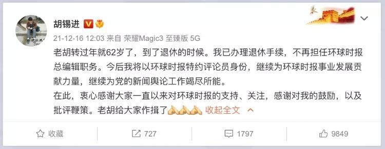 12月16日中午,著名媒体人胡锡进在个人微博上发文称,他已办理退休手续,不再担任《环球时报》总编辑职务。同时,其微博认证已改为“《环球时报》特约评论员”。
