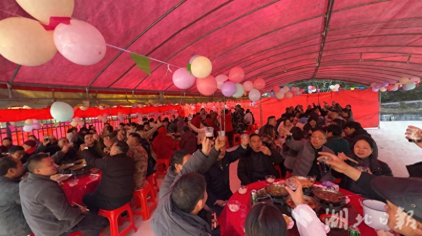 除夕这天,咸丰县清坪镇兰家沟村4组格外热闹,33户农家130多人一起吃团年饭,一起歌舞联欢——咱们老百姓,今儿个真高兴!