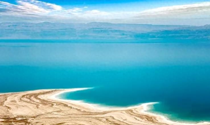 第一,死海有个外号叫地球的肚脐儿,为什么呢?因为它的海拔是负的,是负430.5米,你若从空中看这死海,就像是凹进去了一块。