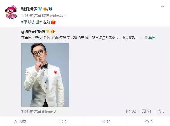 刚刚,李咏妻子哈文发微博称李咏去世:在美国,经过17个月的抗癌治疗,2018年10月25日凌晨5点20分,永失我爱……
