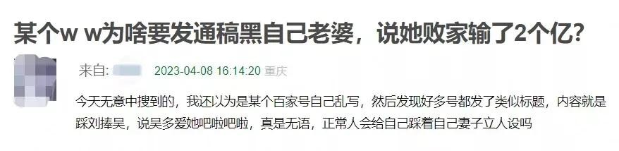某瓣上面有瓜友发帖说吴奇隆这两天在买通稿黑自己老婆,说他在刚结婚的时候给了刘诗诗价值两个亿的公司股份,结果被刘诗诗拿去做投资,现在亏到只有一百多万。吴奇隆不仅没有责怪她,反而还说“是钱重要还是爱重要”。关于这件事情乱七八糟的猜测还蛮多的,有说是因为关于两个人离婚的猜测太多了,吴奇隆特意发通稿来立个宠妻人设。还有说因为张继科,吴奇隆去赌场的事情也被扒出来了,所以把老婆推出来给自己挡枪。