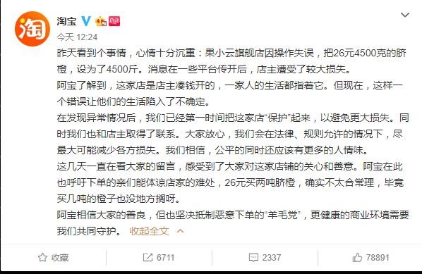 淘宝回应“26元可买两吨脐橙”:坚决抵制恶意“薅羊毛”,已对店铺保护