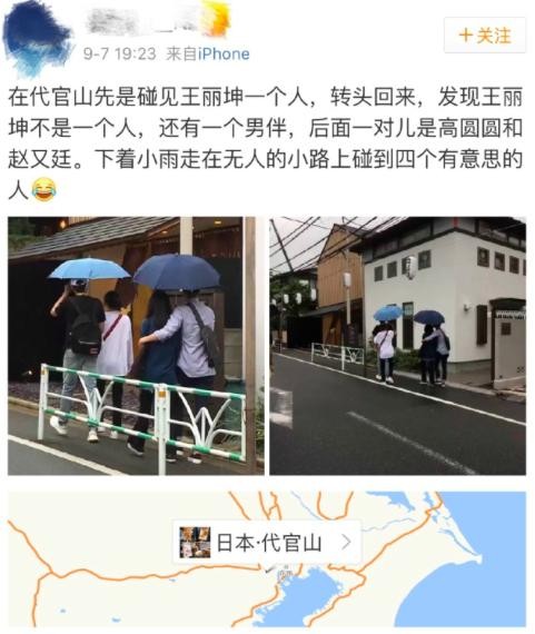 9月7日,有网友通过微博曝光疑似林更新、王丽坤和高圆圆赵又廷同游日本的照片,并称:“在官代山先是喷见王丽坤一个人,转头回来,发现王丽坤不是一个人,还有一个男伴,后面一对是高圆圆和赵又廷。下着下雨走在无人的小路上碰到四人有意思的人。”