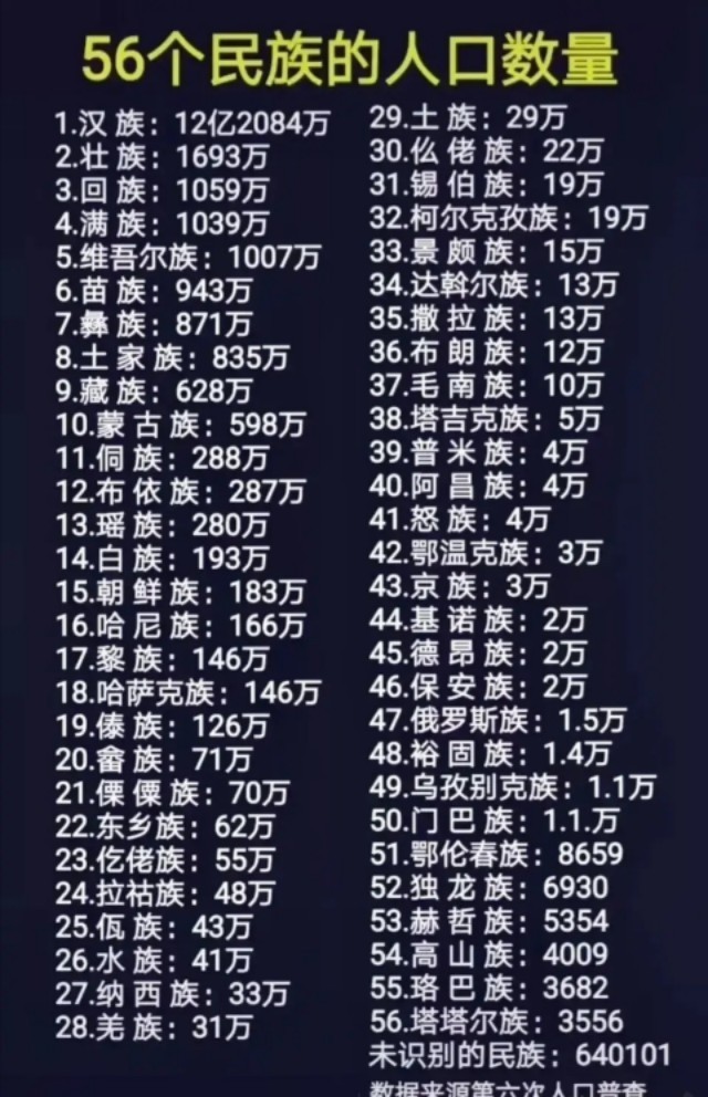 中国是个多民族的国家,全国有56个民族,汉族是人口最多的名族,第二位的是壮族,主要分布在广西,云南是少数名族最多的地区,人口最少的名族人口数量不足5000人,以下是56个名族人口数量表,以供参考!