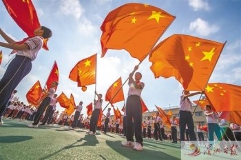 9月25日,莆田城厢区南门学校举行庆祝新中国成立70周年主题活动,师生挥舞国旗,共同高唱《我和我的祖国》等,用歌声表达祝福。(湄洲日报记者 蔡昊 摄)