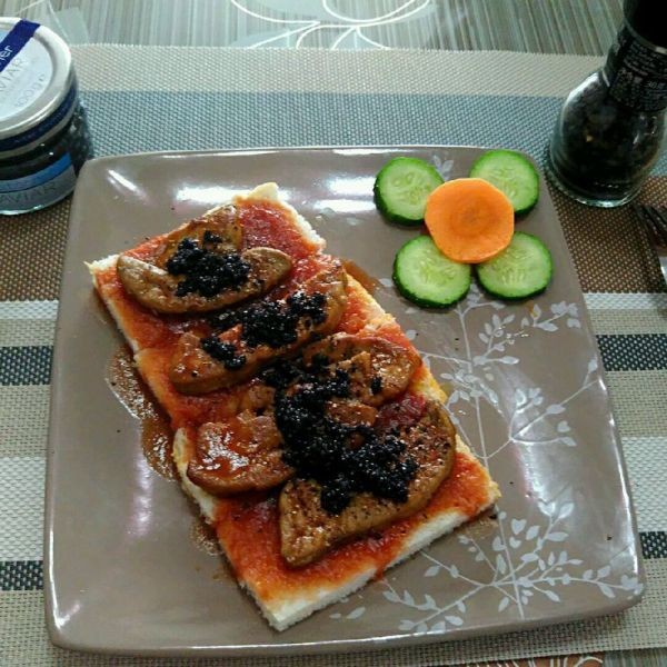 5、将鹅肝放在吐司底座上。让吐司吸收鹅肝的油脂,并在表面撒上黑胡椒。
