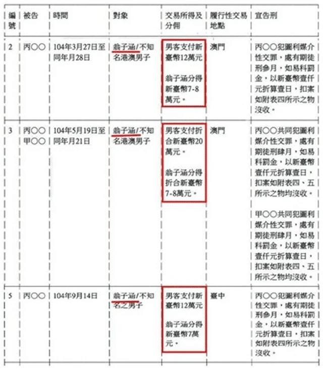 没想到台媒却扒出翁子涵卖身的实锤,据报道,翁子涵出道之后曾经整容,之后参与卖身,甚至会到国外进行。警方曾经抓到翁子涵联系卖身的中介,最后法院判决书曝光,实锤了翁子涵有3次卖身,3个案子分别是当年3月、5月、9月,翁子涵每次拿到手的钱约1.9万人民币,这些都是清清楚楚记录在法院判决书里。