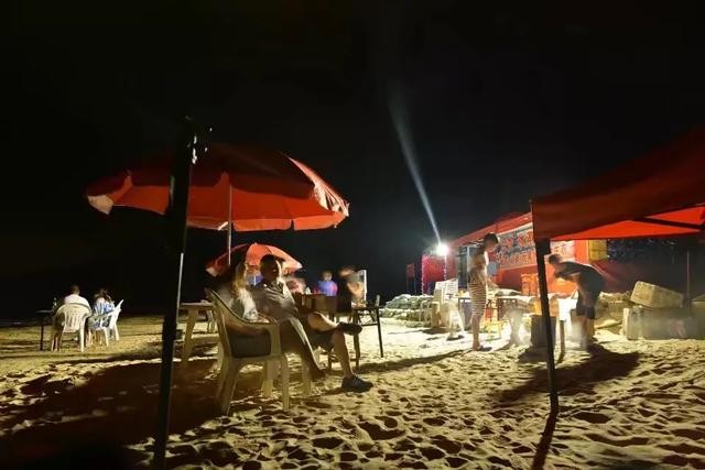 夜晚,沙滩上有烧烤,篝火晚会,卡拉OK等娱乐设施。
