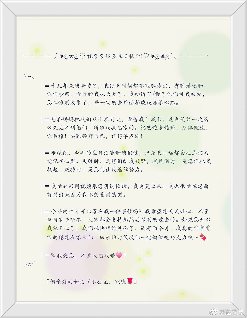 4月10日,赵文卓在微博晒出一家人的幸福合照庆生,还有女儿写给他的祝福信,十分感人。赵文卓妻子张丹露随后转发祝福。