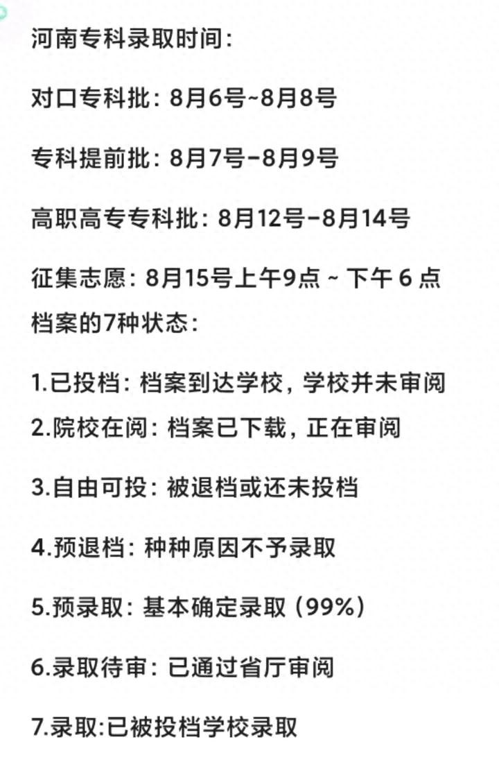 近几日是专科各批次的录取时间,而8月12日是河南省高职高专批录取的时间,这在专科批里是涉及考生最多的批次。
