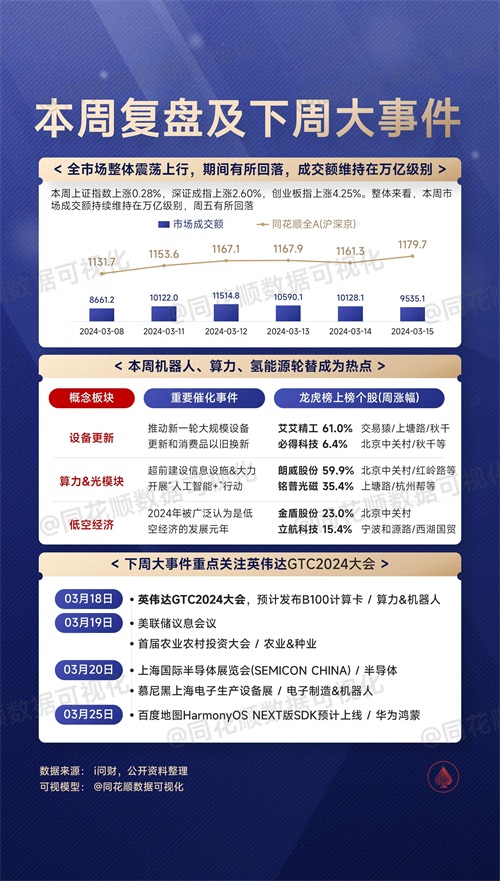 本周复盘:全市场震荡上行,期间有所回落,成交额维持在万亿左右。题材上,设备更新、算力、机器人轮替成为热点,下周重点关注英伟达GTC2024大会。