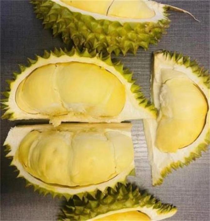 接下来,看颜色。成熟的榴莲通常呈黄色或绿色。如果榴莲呈暗黄色或黑色,可能是过熟或腐烂的,不建议购买。