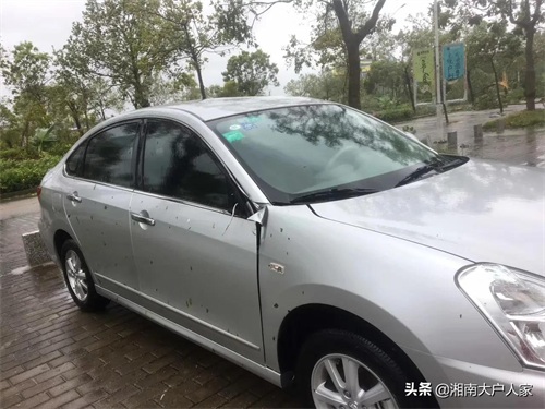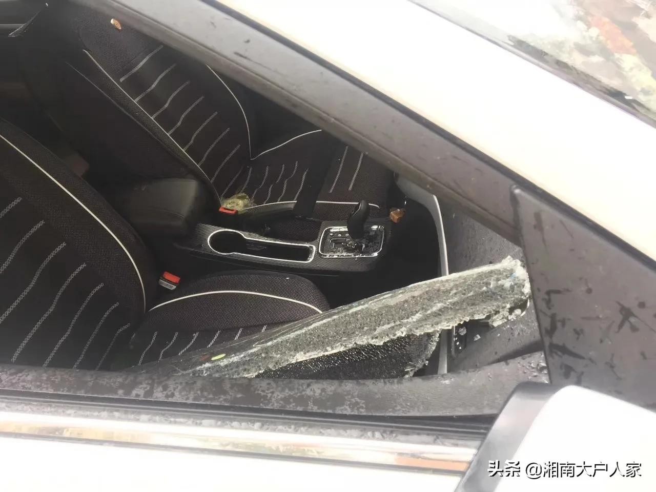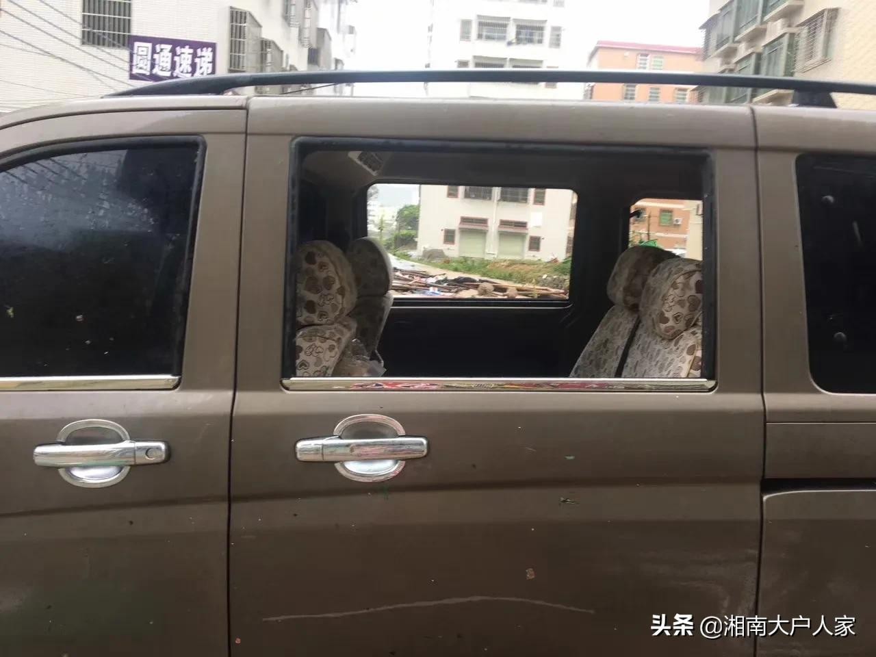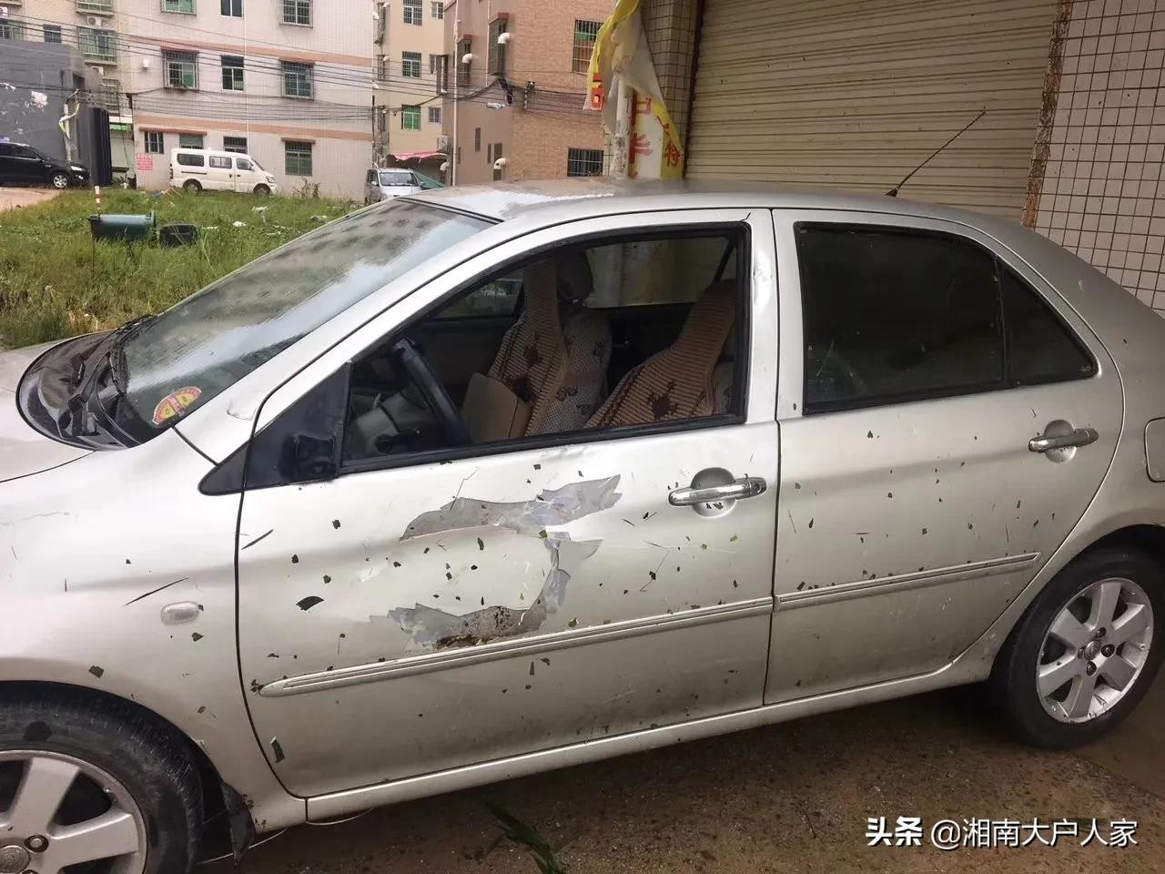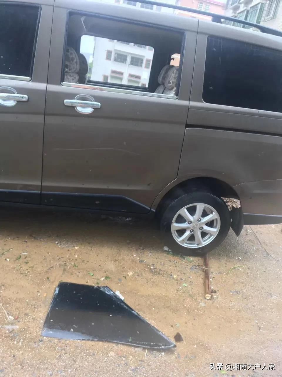 地上的铁皮、花盆、木头被大风刮起来直接撞碎小汽车的玻璃和车身,台风的威力