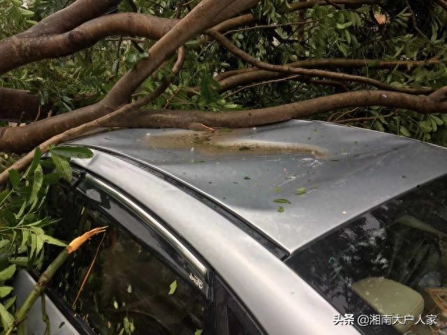 被大风刮断的树枝压在小汽车顶上
